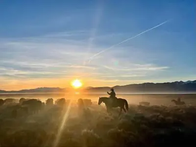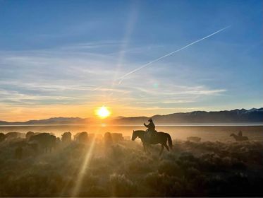 Remi’s photograph captures a breathtaking scene of rider and horse set against a dramatic Eureka County sky. The silhouette of the pair stands tall in the sagebrush as golden light breaks through the clouds, creating a powerful contrast of shadow and color. The image reflects the quiet strength of ranch life and the timeless bond between people, animals, and the land.