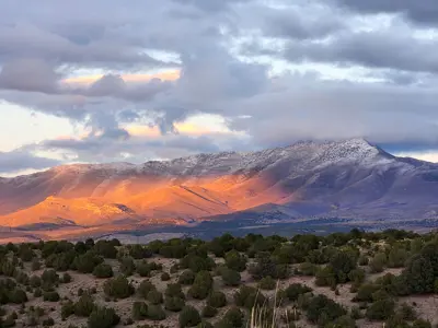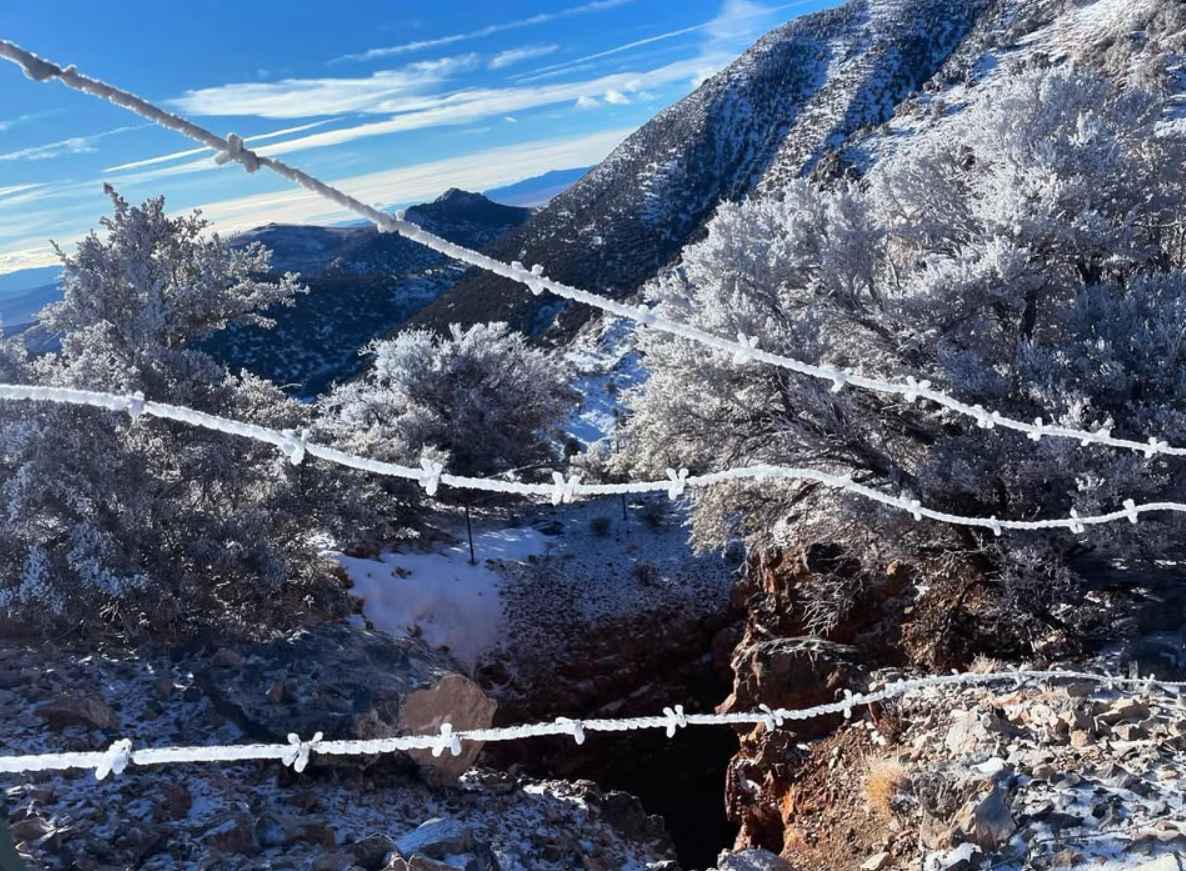Abby captures the serene beauty of a frosty morning in Eureka County, where barbed wire glistens with ice and snow-draped trees frame a breathtaking view of rugged terrain under a clear blue sky. A perfect reminder of nature's delicate yet untamed artistry.